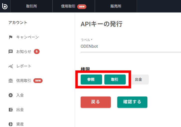 ラベルは任意のものを入力し、権限は「参照」「取引」にチェックを入れて「確認する」をクリック