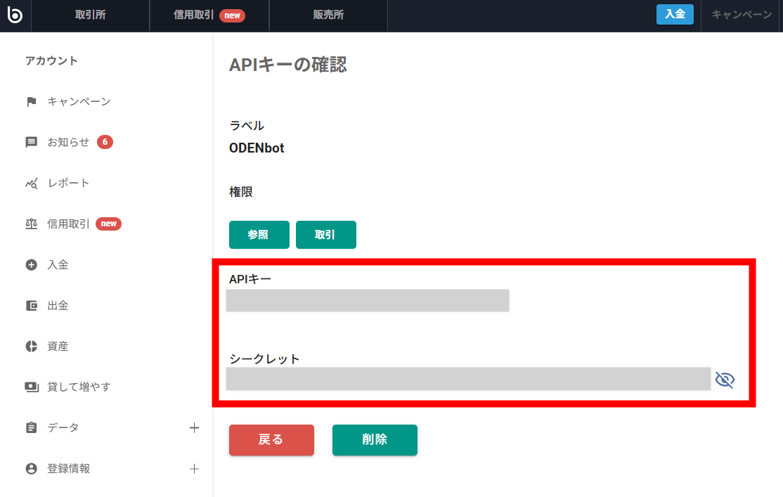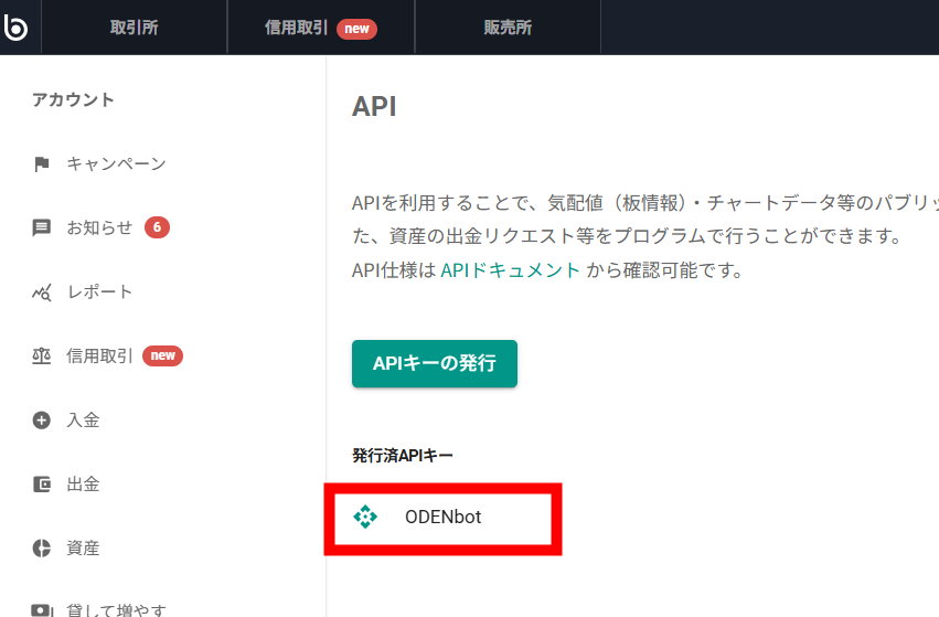 ODENbotの「口座」タブからBitbankを選択し、APIキーを入力すれば完了です
