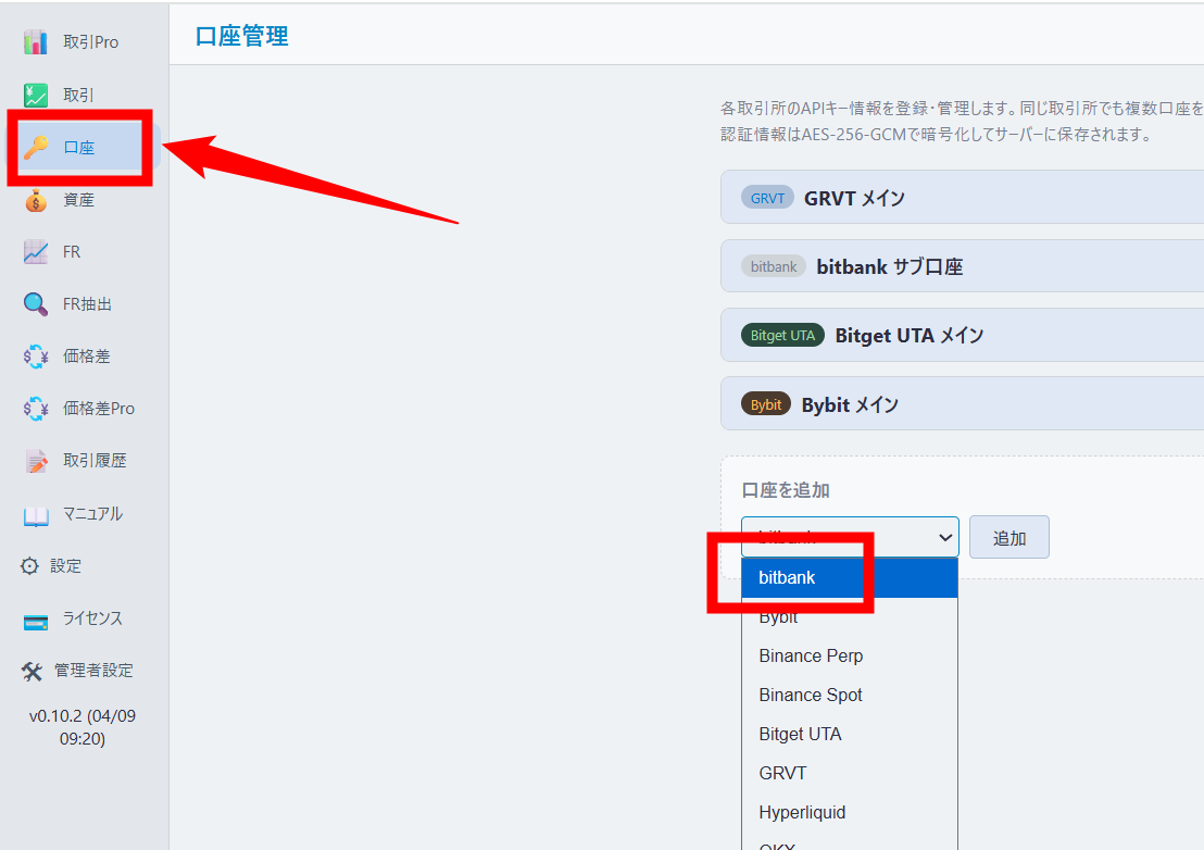 ODENbotの「口座」タブからBitbankを選択し、APIキーを入力すれば完了です
