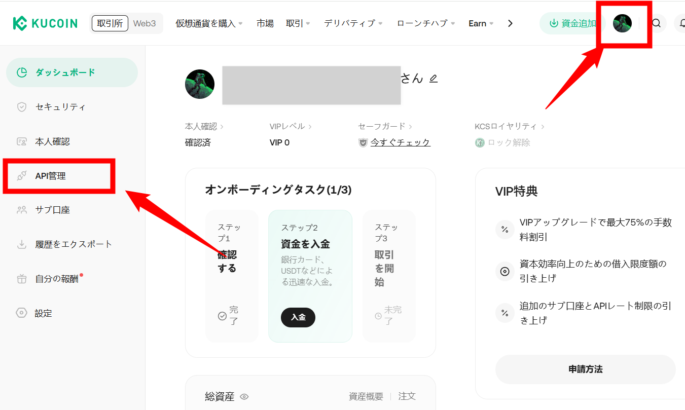 右上のアイコンをクリックしたら、左の「API管理」をクリック