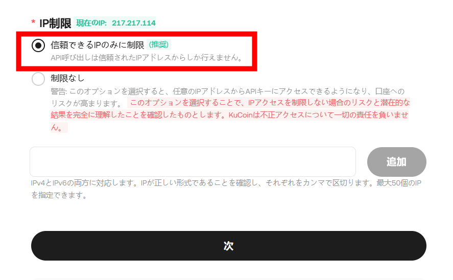 IP制限は、「信頼できるIPのみに制限」をクリックして、ODENbotのサーバーIPアドレス(トレード画面アクセス時のURL http://◯◯◯.◯◯.◯◯.◯◯:8080/ の◯の部分)を入力して、最後に右下の「追加」ボタンをクリック。