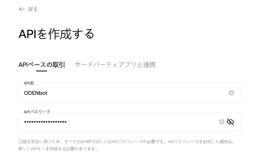 「APIベースの取引」タブを選択して、API名は任意のものを、APIパスワード(パスフレーズ)も任意のものをいれますが、あとで使うのでメモしておきましょう。