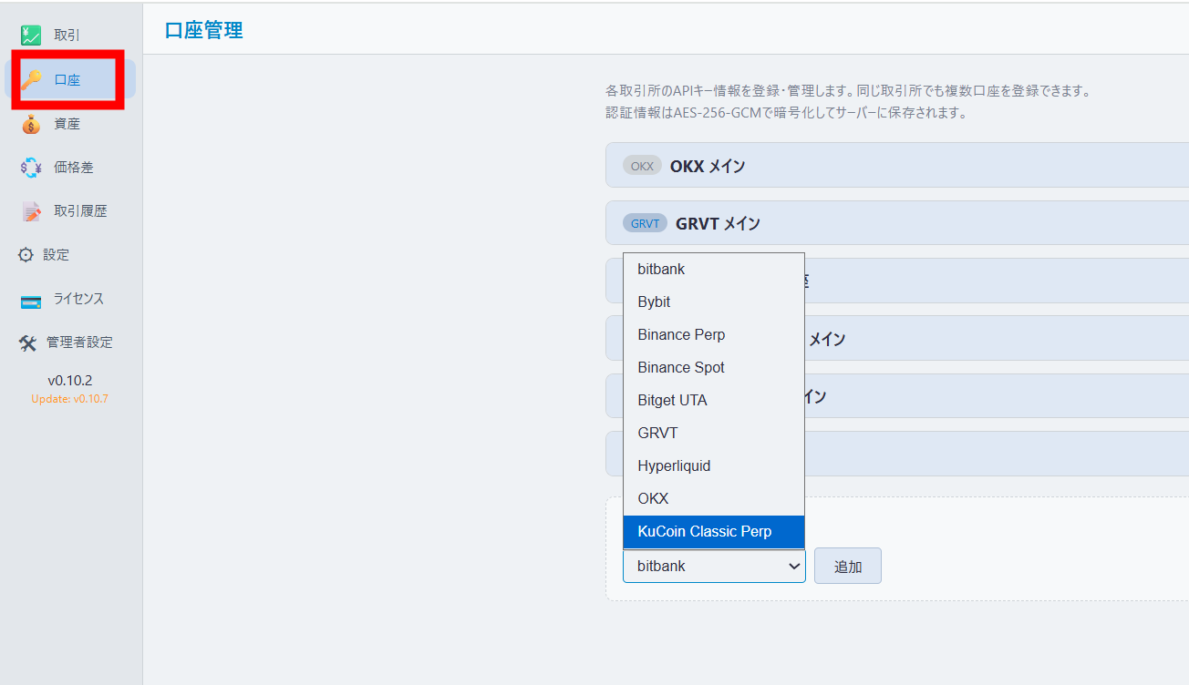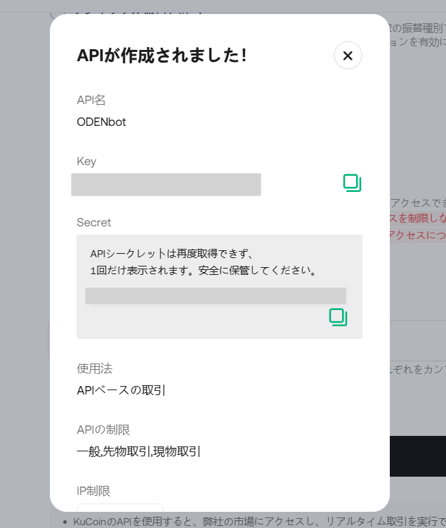 ODENbotの「口座」を開いて、KucoinのAPIを登録すれば完了です