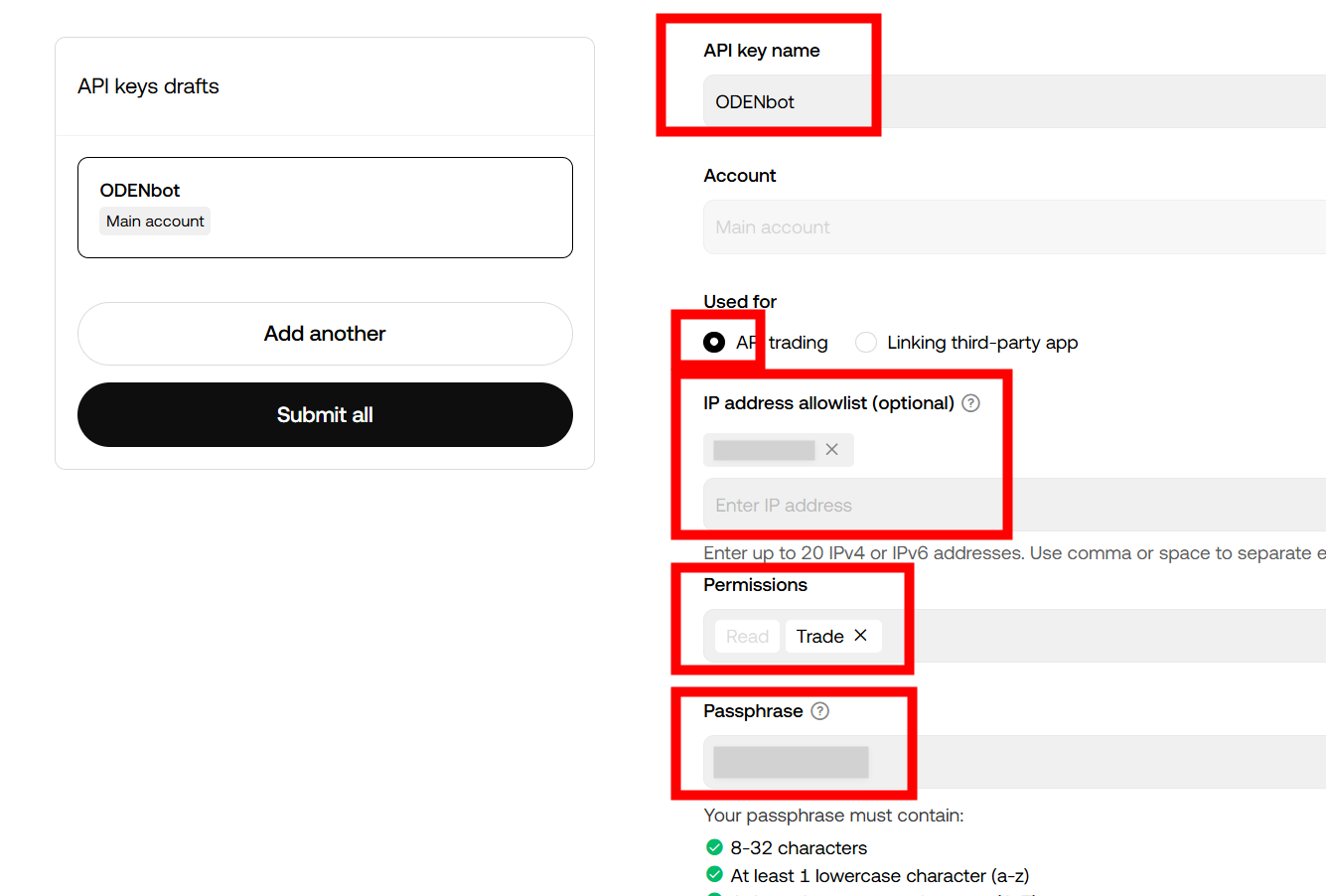 IP address allowlist:ODENbotのサーバーIPアドレス(トレード画面アクセス時のURL http://◯◯◯.◯◯.◯◯.◯◯:8080/ の◯の部分)