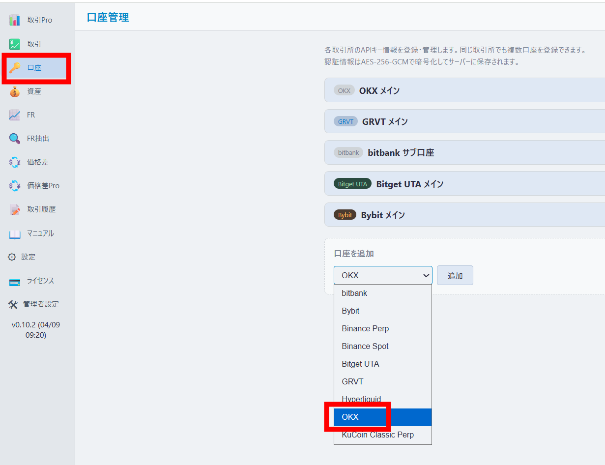 ODENbotの「口座」タブからOKXを選択して、APIキー、シークレットキー、パスフレーズを入力すれば完了です。