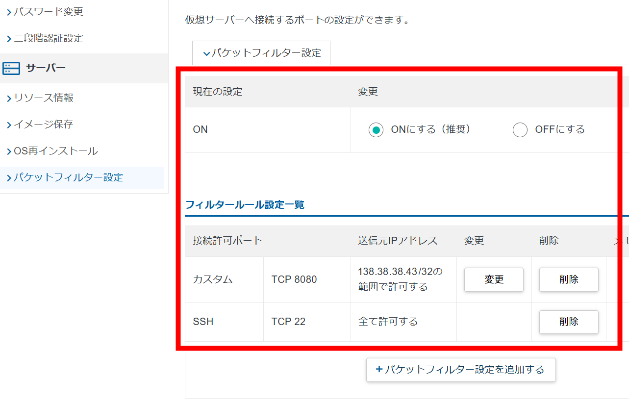 もう一度、「パケットフィルター設定」をクリックして、今度は「フィルター:SSH」を追加します。