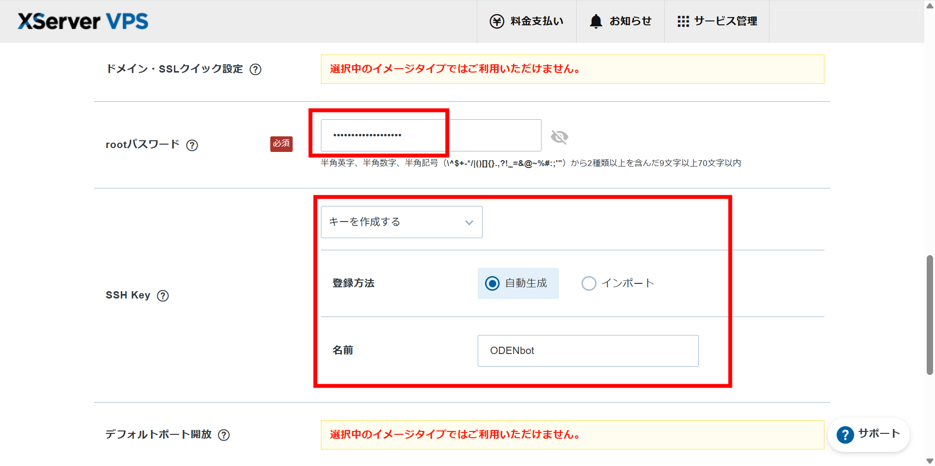 「rootパスワード」はLinuxにログインするためのもので、任意で決めてください。ただしSSH Keyのほうが強力なので、ここで作っておきます。