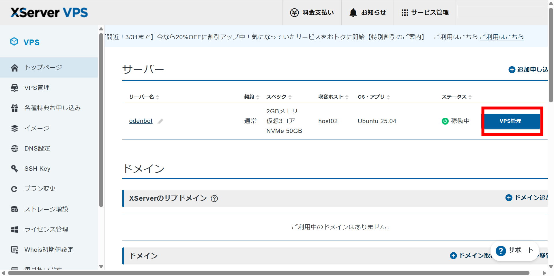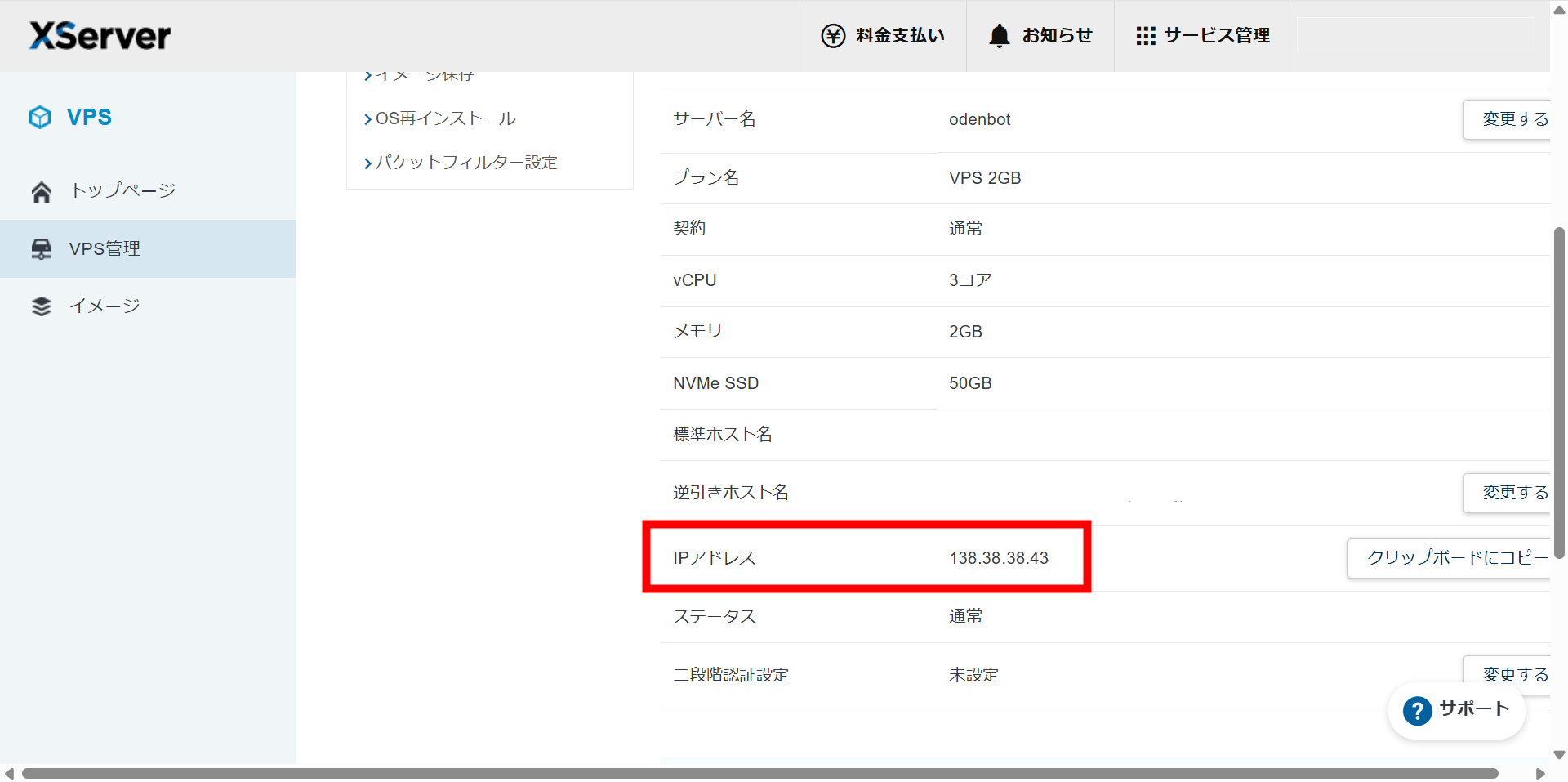 xserverVPSのトップページから「VPS管理」をクリック