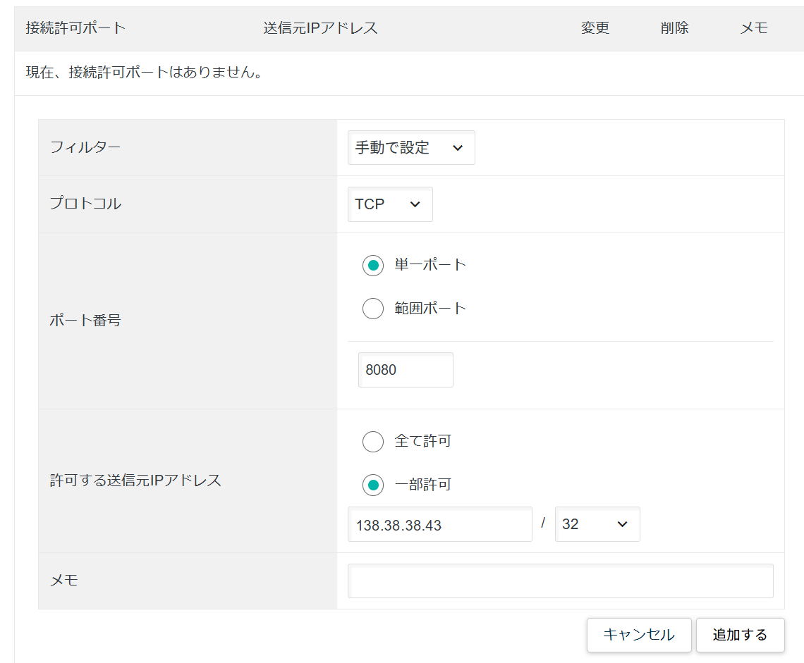 「フィルター:手動で設定」、「プロトコル:TCP」、「ポート番号:単一ポートで8080」、「許可する送信元IPアドレス:一部許可を選択してご自宅のIPアドレス /32」を入力したら「追加する」をクリック