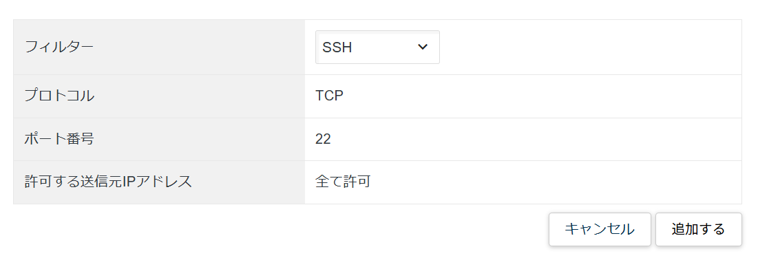 もう一度、「パケットフィルター設定」をクリックして、今度は「フィルター:SSH」を追加します。