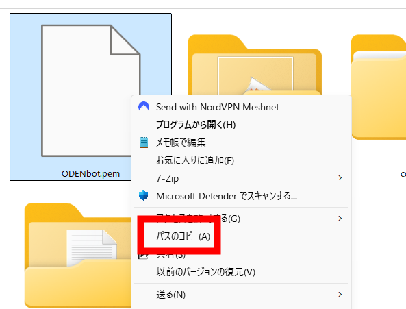 まず、先程ダウンロードした.pemファイルのうえで右クリックして、「パスのコピー」をクリックします。