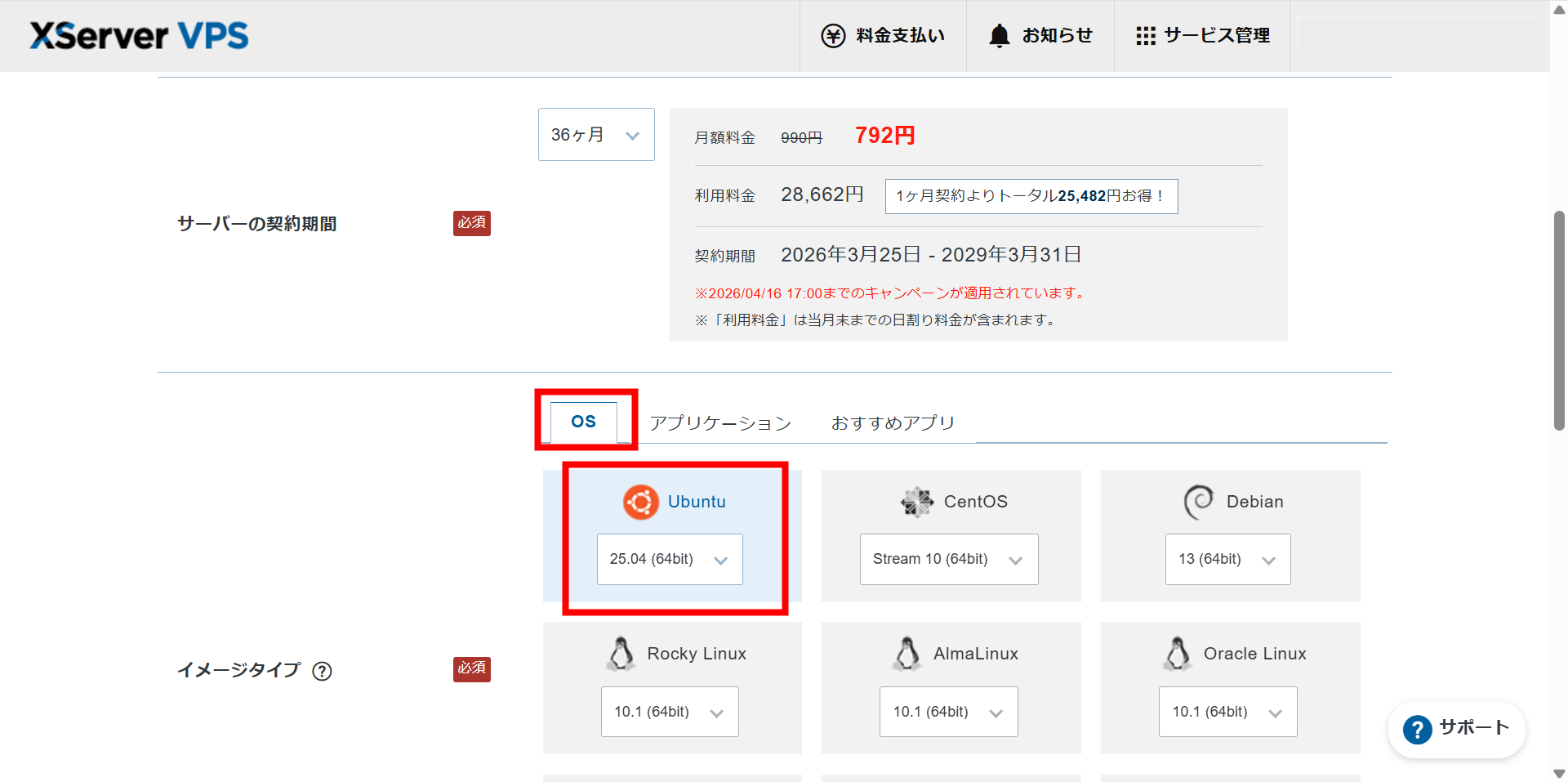 サーバーの契約期間は任意で、イメージタイプは「OS Ubuntu 25.04」を選択