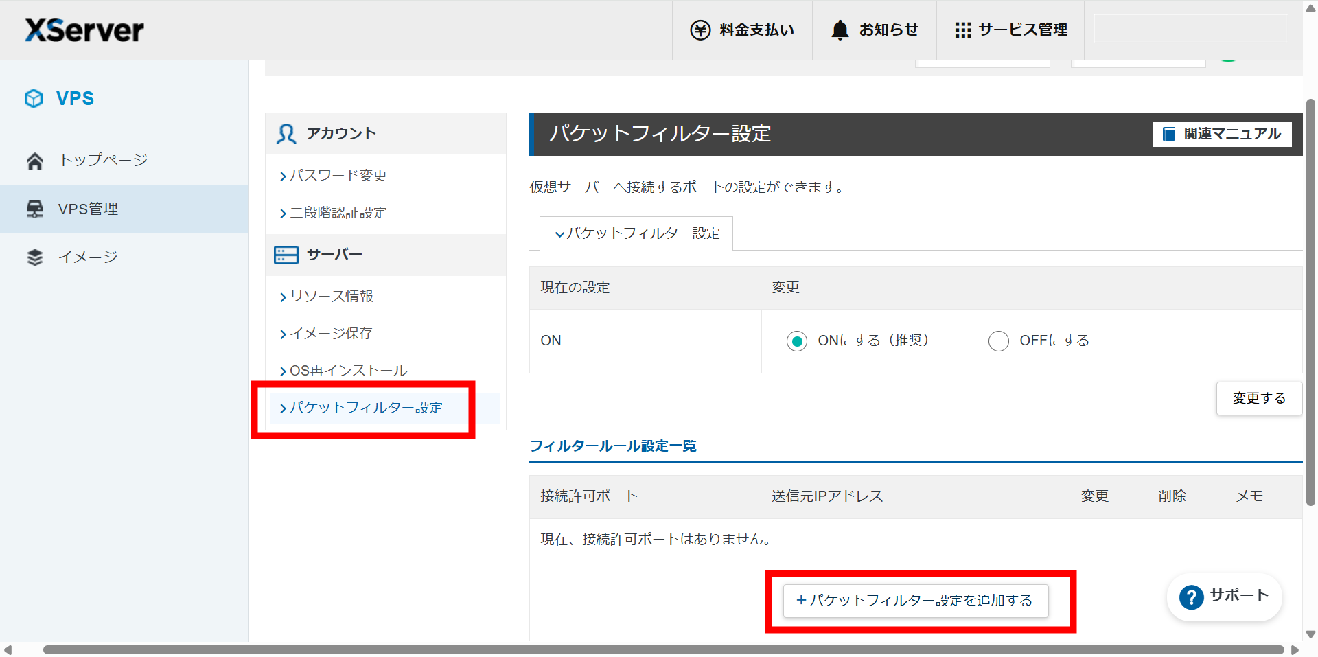 ② Xserver VPSのパネルで「パケットフィルター設定」に、ポート番号8080の許可ルールを追加しましたか?