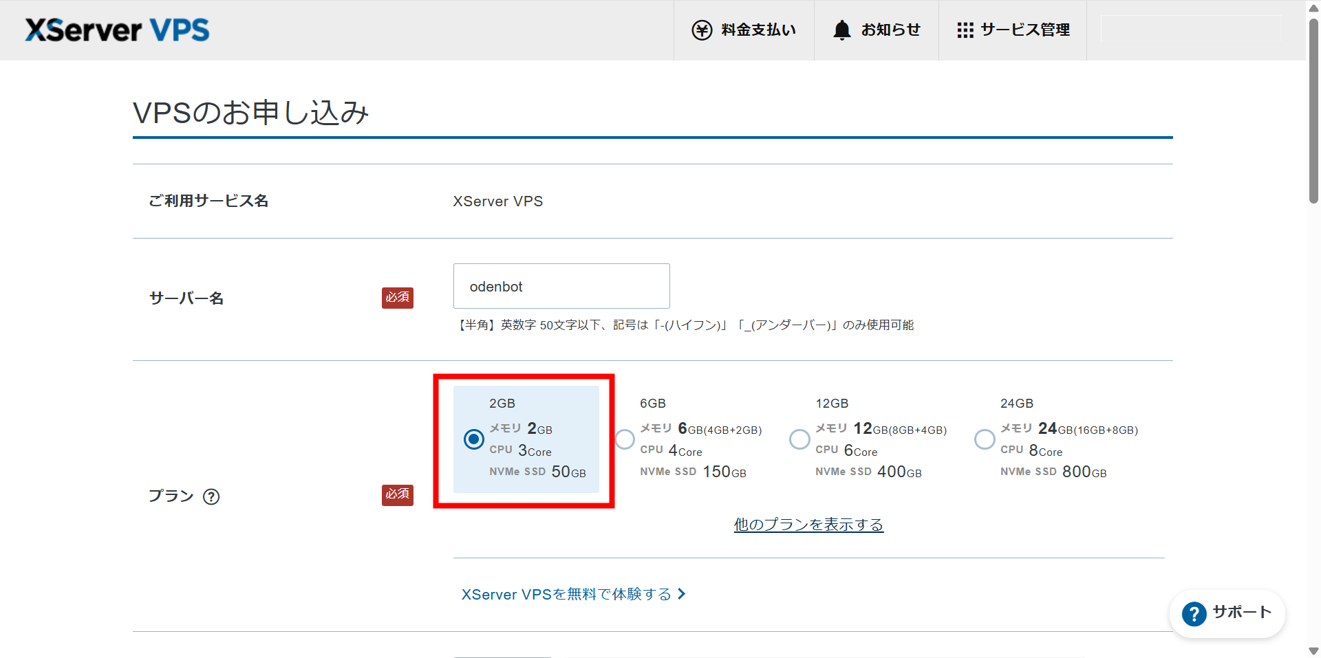 VPSのお申込み画面では、「サーバー名:任意」、「プラン:2GB」を選択