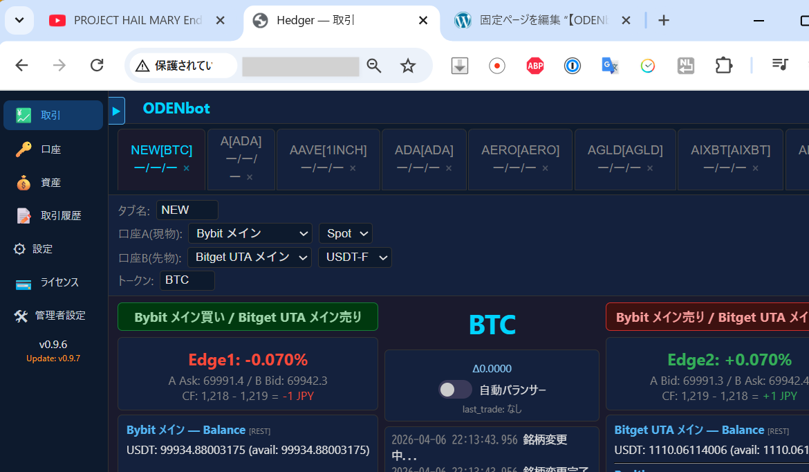 Windows版とは違い、ODENbotの操作画面を開くだけなら「.pemファイル」などの難しい鍵は必要ありません。ブックマークに登録しておけば、外出先のカフェや移動中のスマホからでも、いつでも運用状況をチェックできますよ。